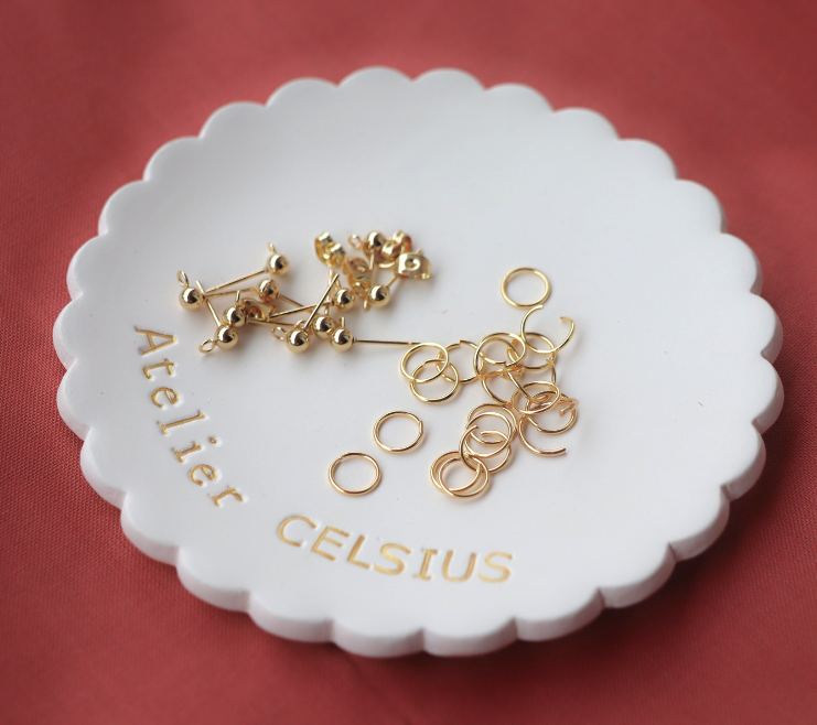 (Enfin, qu’est-ce que les apprêts ? Il s’agit des puces, clous ou créoles d’oreilles, supports de broches, anneaux et autres breloques que vous trouverez de deux coloris différents : or ou argent)